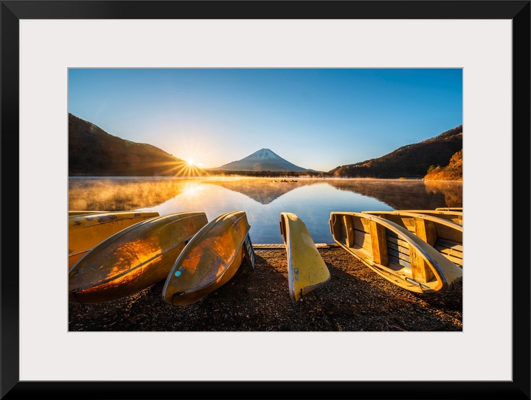 <p>Boats moored at lake Shoji and Mt. Fuji, Yamanashi Prefecture, Japan.</p>