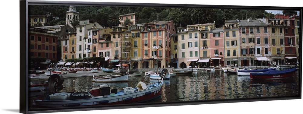 <p>Panoramic photograph on a big canvas of a many boats anchored in the Italian Riviera harbor, a line of tall, colorful buildings along the shore in the background, in Portofino, Italy.</p>