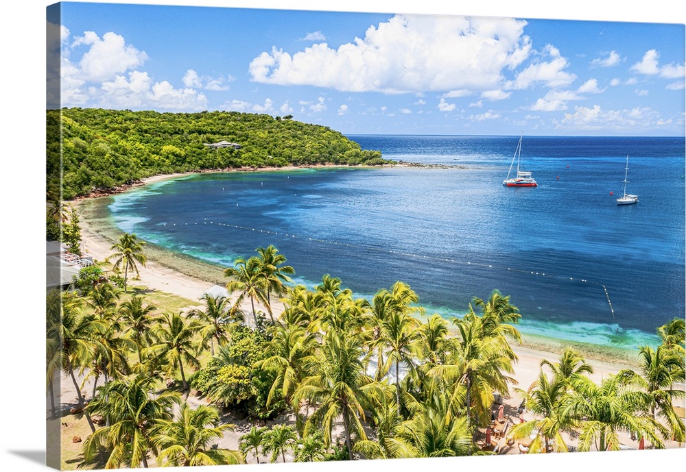 <p>Boats moored in a tropical lagoon near the palm fringed Galleon beach, aerial view, English Harbour, Antigua, Caribbean</p>