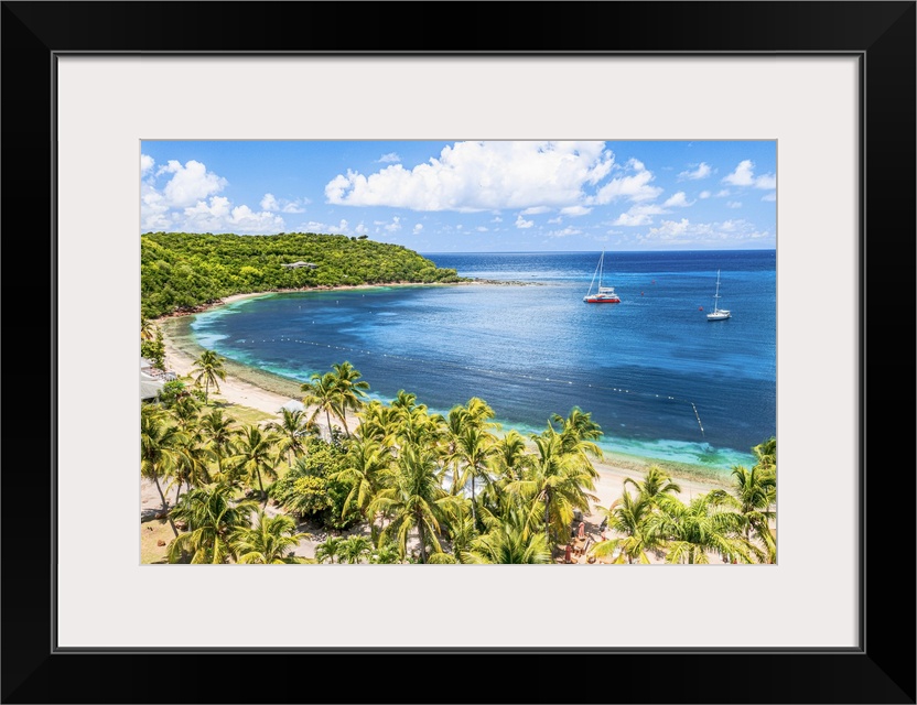 <p>Boats moored in a tropical lagoon near the palm fringed Galleon beach, aerial view, English Harbour, Antigua, Caribbean</p>