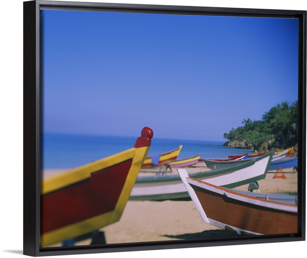 <p>Big canvas photo of colorful wooden boats sitting on a beach with an ocean in the background.</p>
