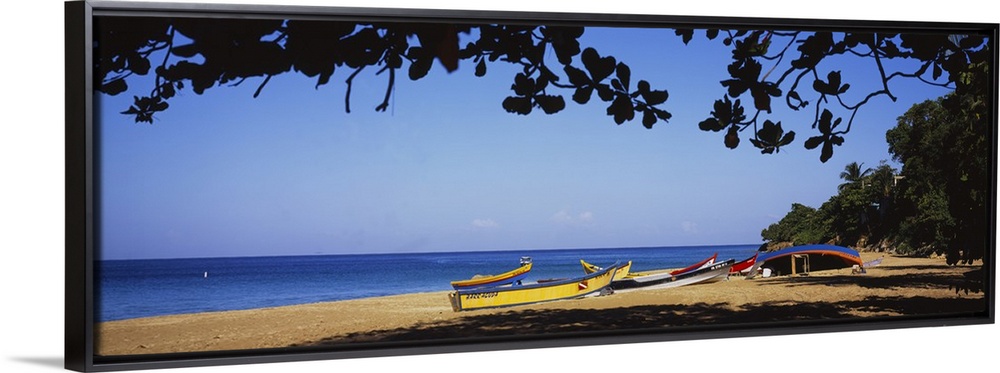 <p>This is a panoramic photograph of boats on the sandy shore and framed with tropical foliage.</p>