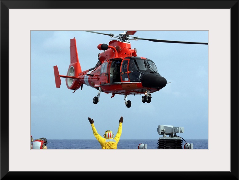 <p>Pacific Ocean, November 30, 2007 - Boatswain Mate directs a Coast Guard HH-65A Dolphin aboard the guided-missile destroyer USS Russell (DDG-59), during a friends and family cruise to Maui, Hawaii. More than 250 family members, friends, and ship supporters rode the ship to witness a variety of shipboard operations.</p>