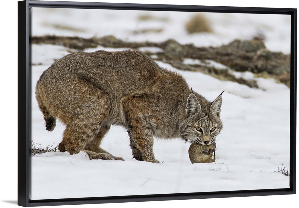 <p>A lynx clutching its freshly caught prey in its mouth.</p>
