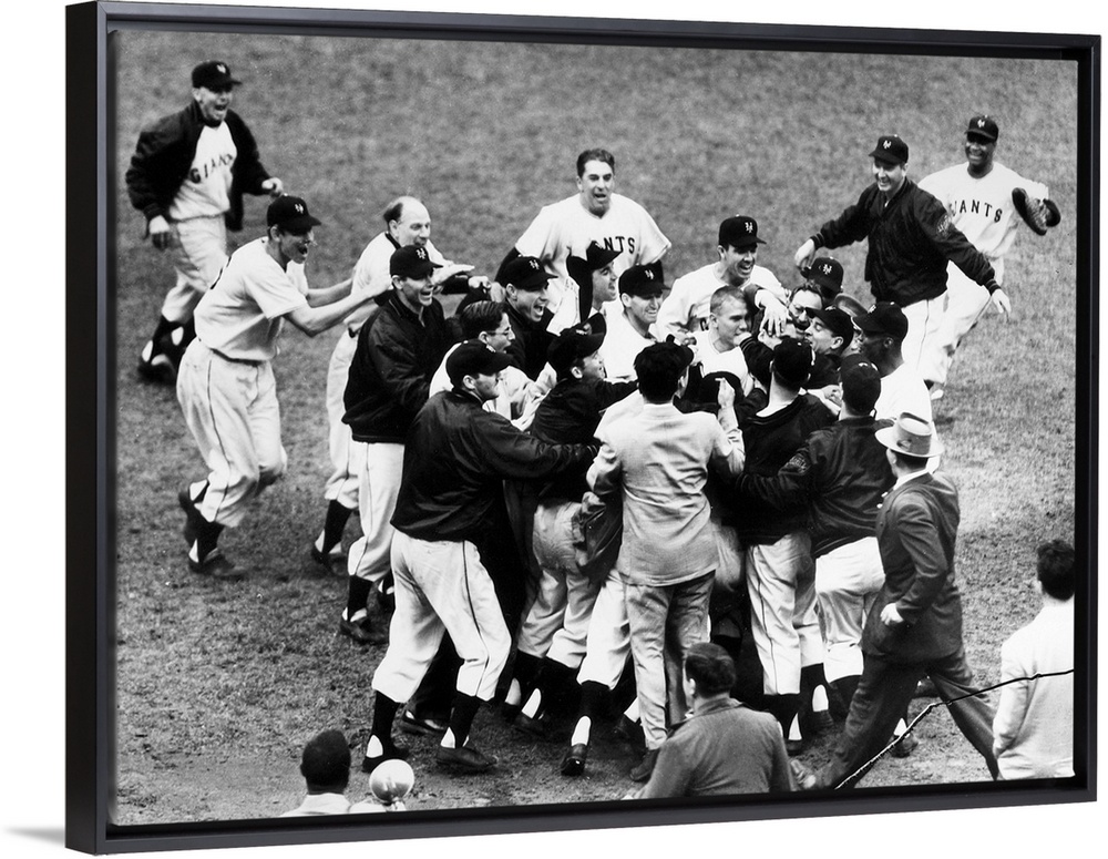 <p>Bobby Thomson of the New York Giants being mobbed by teammates and fans after hitting his pennant-winning home run, the so-called 'Shot Heard 'round the World,' against the Brooklyn Dodgers at the Polo Grounds in New York City, 3 October 1951. The hatless man third from left is Giants manager Leo Durocher.</p>