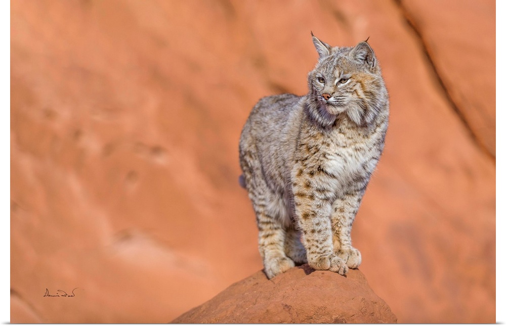 <p>Juvenile bobcat (Lynx rufus) posing on the sandstone cliffs of Monument Valley, Arizona, USA.</p>