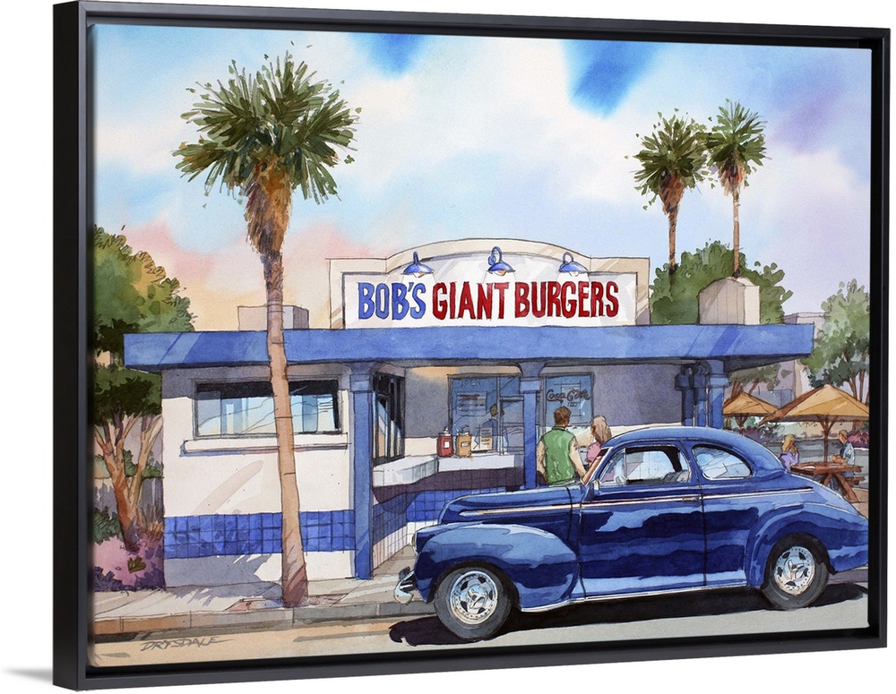 <p>Watercolor painting of a 41 Chevy parked at Bob's Hamburger Stand in Fremont, CA.</p>