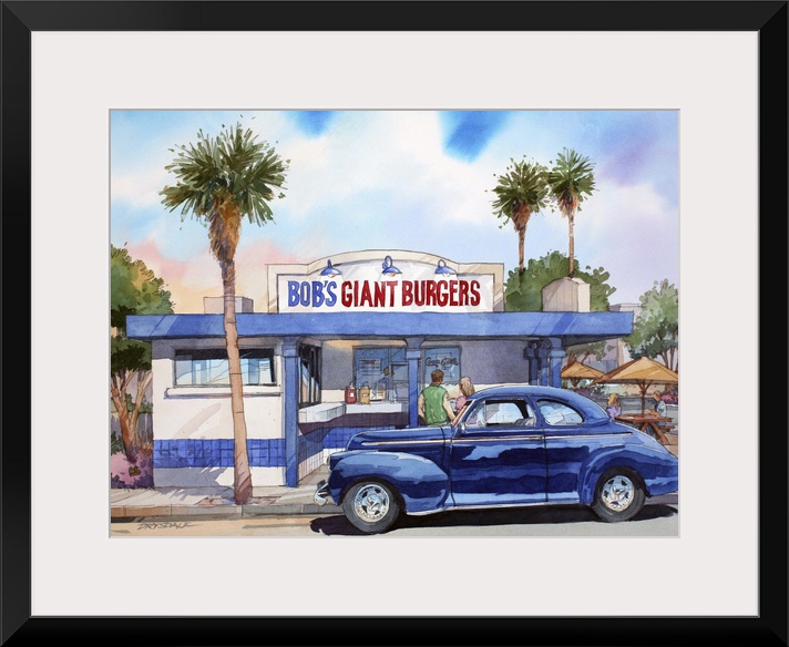 <p>Watercolor painting of a 41 Chevy parked at Bob's Hamburger Stand in Fremont, CA.</p>