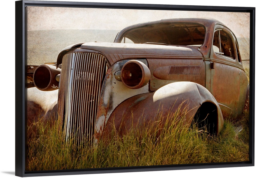 <p>Photograph of a broken down and beat up vintage car in a junkyard.</p>
