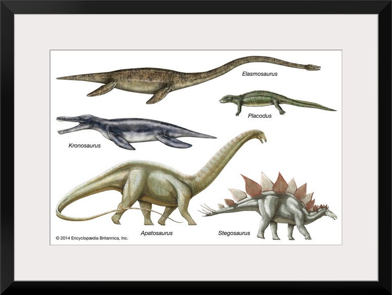 <p>An educational poster from Encyclopaedia Britannica featuring the different body types of extinct dinosaurs and ichthyosaurs.</p>