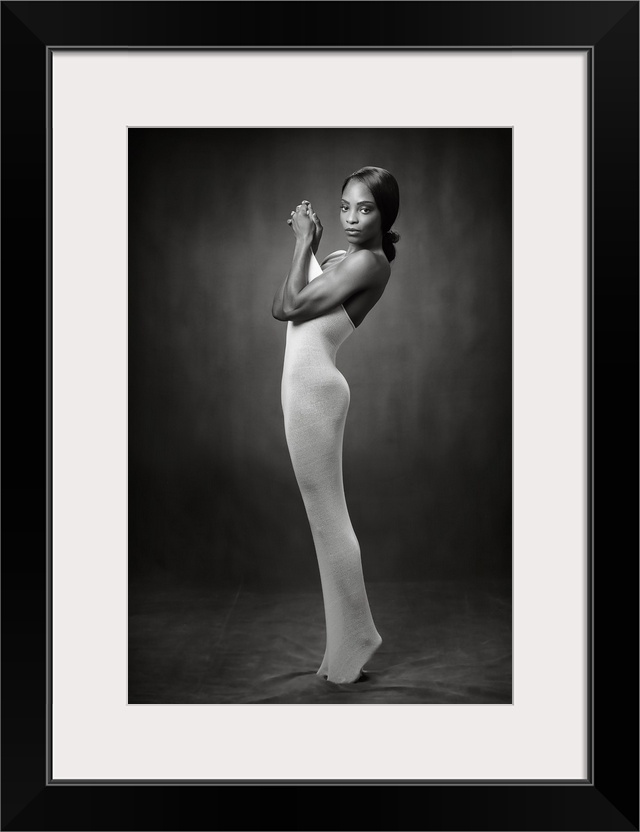 <p>Elegant black and white photograph of a nude woman wearing a tight body sock.</p>