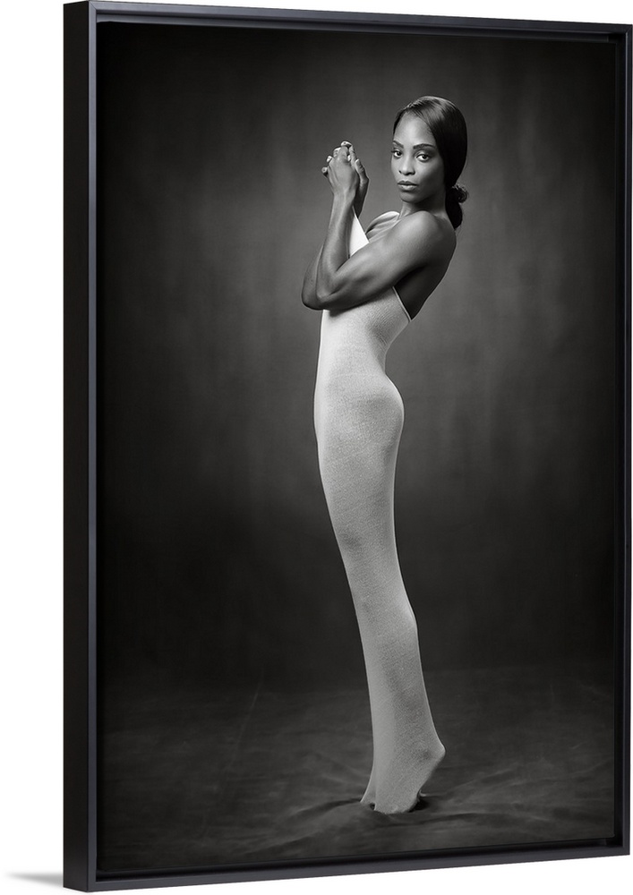<p>Elegant black and white photograph of a nude woman wearing a tight body sock.</p>