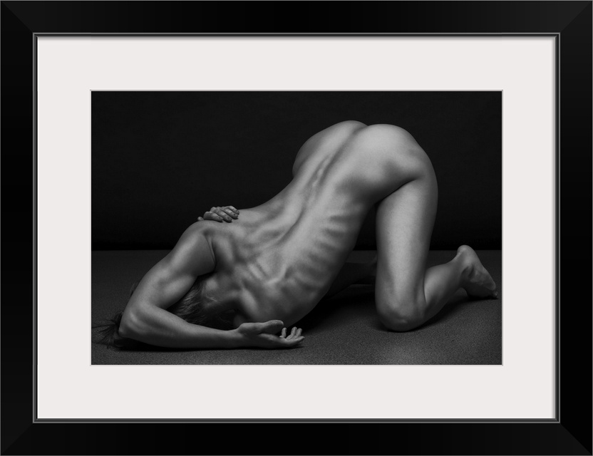 <p>Black and white fine art photograph of a nude woman creating angles and shapes with her body.</p>