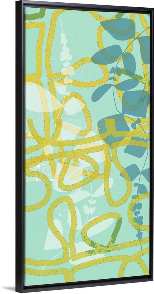 <p>Abstract art piece of bold yellow lines in looping patterns to represent leaves overtop of shadowed lines of leaves and flowers.</p>