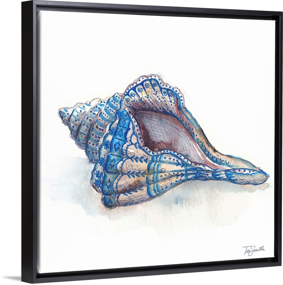 <p>Square artistic painting of a shell in shades of blue and brown on a white background.</p>