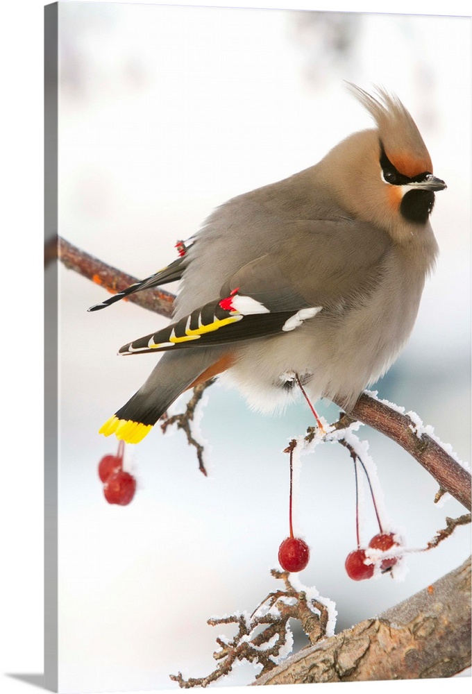 <p>Bohemian Waxing bird feeding on colorful red Mountain Ash berries. Anchorage area in winter of 2012. Southcentral Alaska. Wiinter..</p>