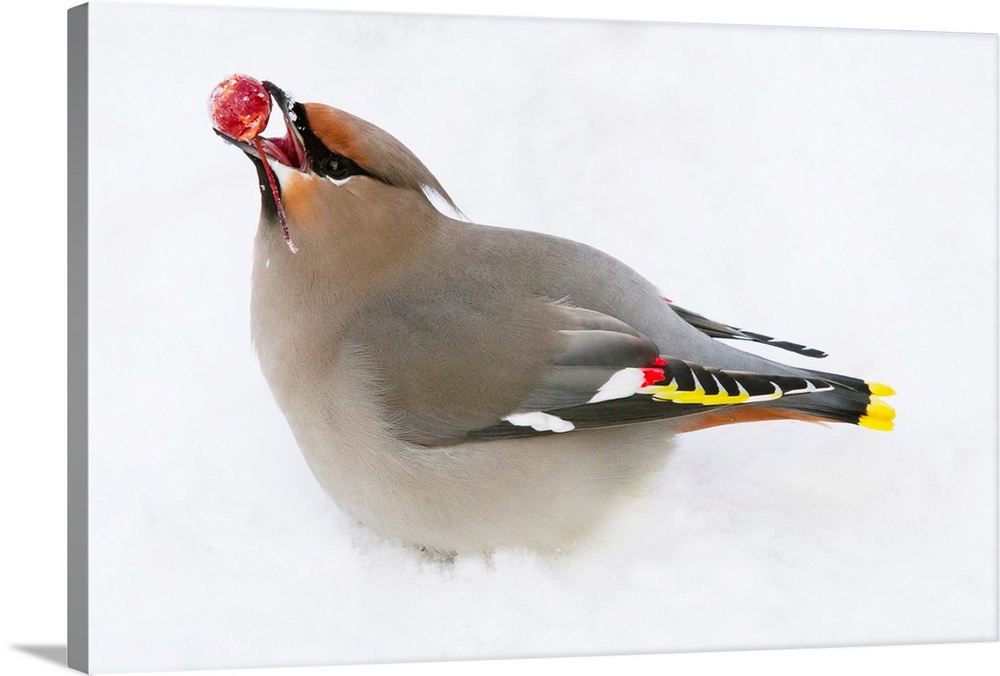 <p>Bohemian Waxing bird feeding on colorful red Mountain Ash berries. Anchorage area in winter of 2012. Southcentral Alaska. Wiinter..</p>