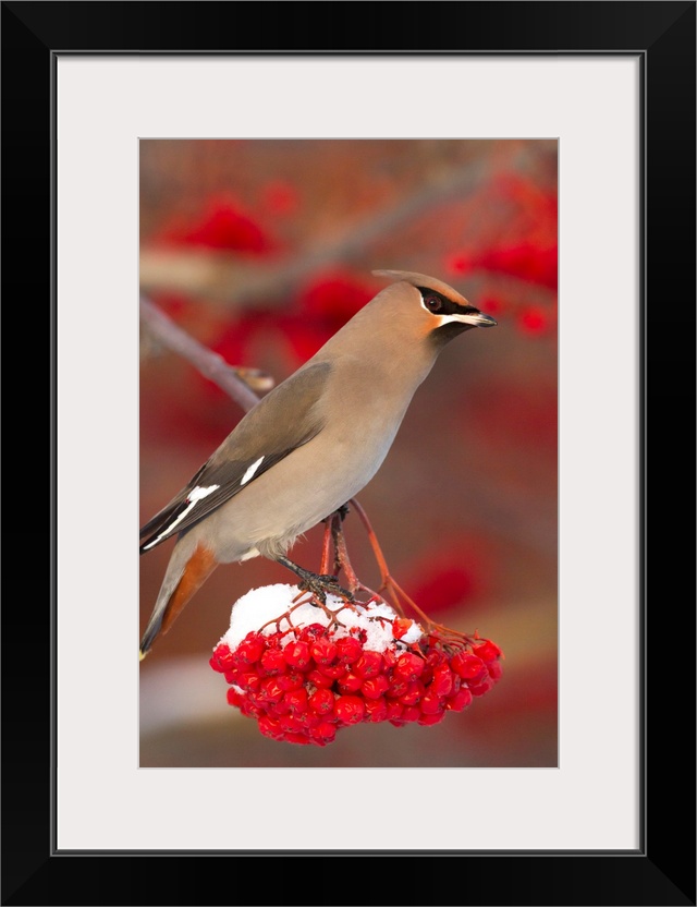 <p>Bohemian Waxwing perches to eat in colorful Mountain Ash berries in winter in the Anchorage, Alaska.</p>