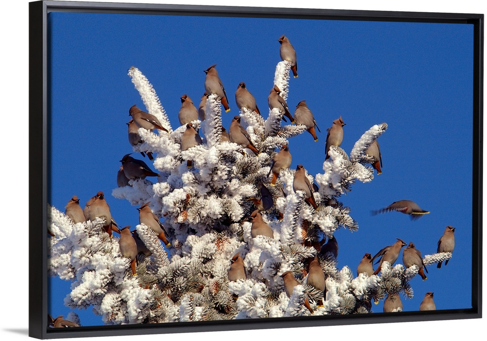 <p>Bohemian Waxwings (Bombycilla garrulus), creating an ornamental look on a hoarfrost covered spruce tree near Vegreville, Alberta, Canada.</p>