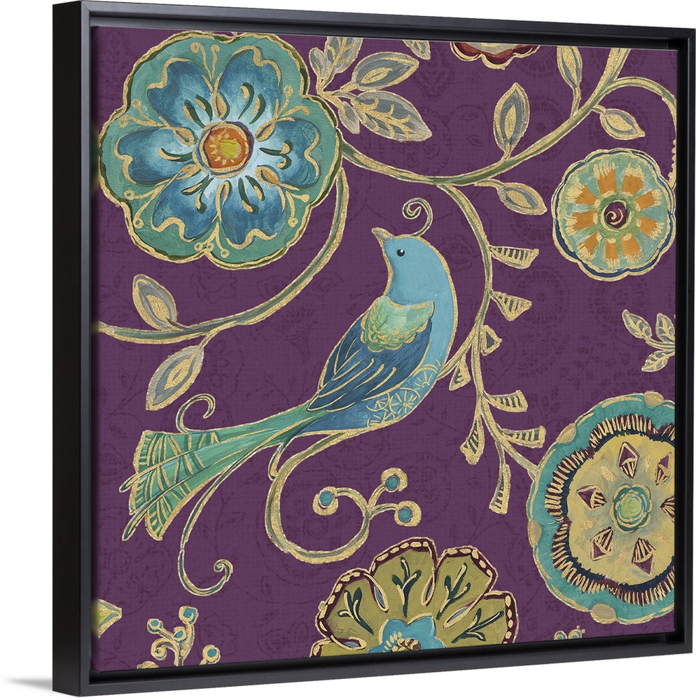 <p>Gold trimmed bird and flowers on a purple floral background.</p>
