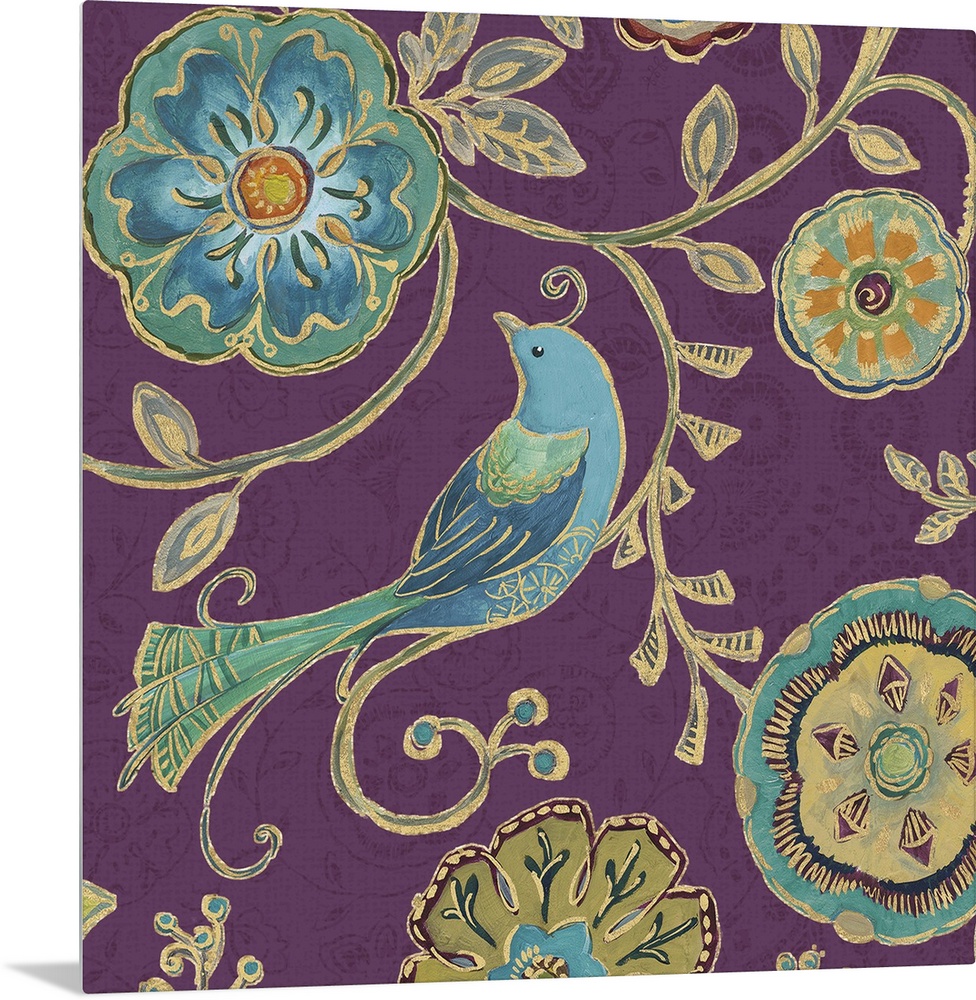 <p>Gold trimmed bird and flowers on a purple floral background.</p>