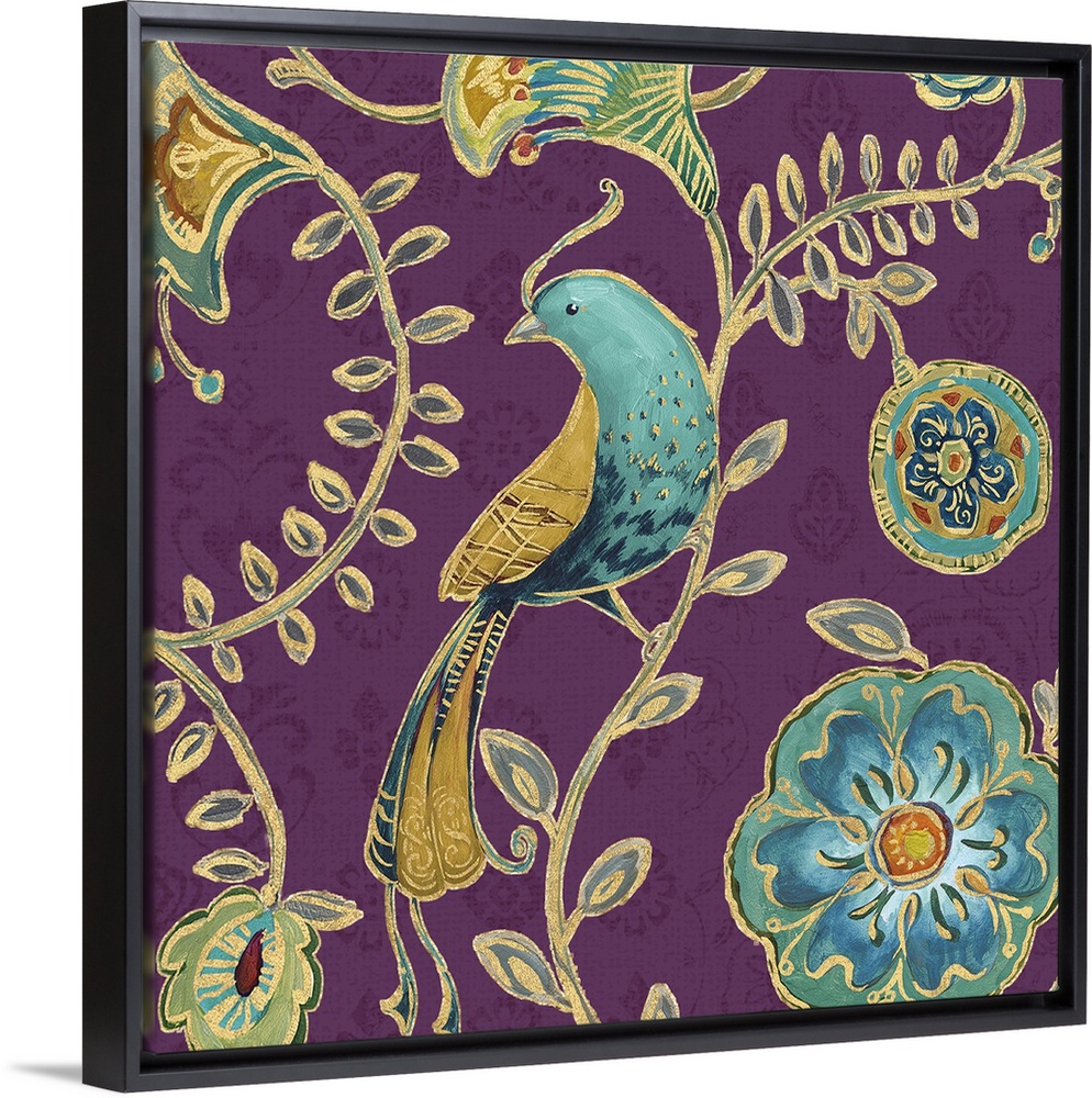 <p>Gold trimmed bird and flowers on a purple floral background.</p>