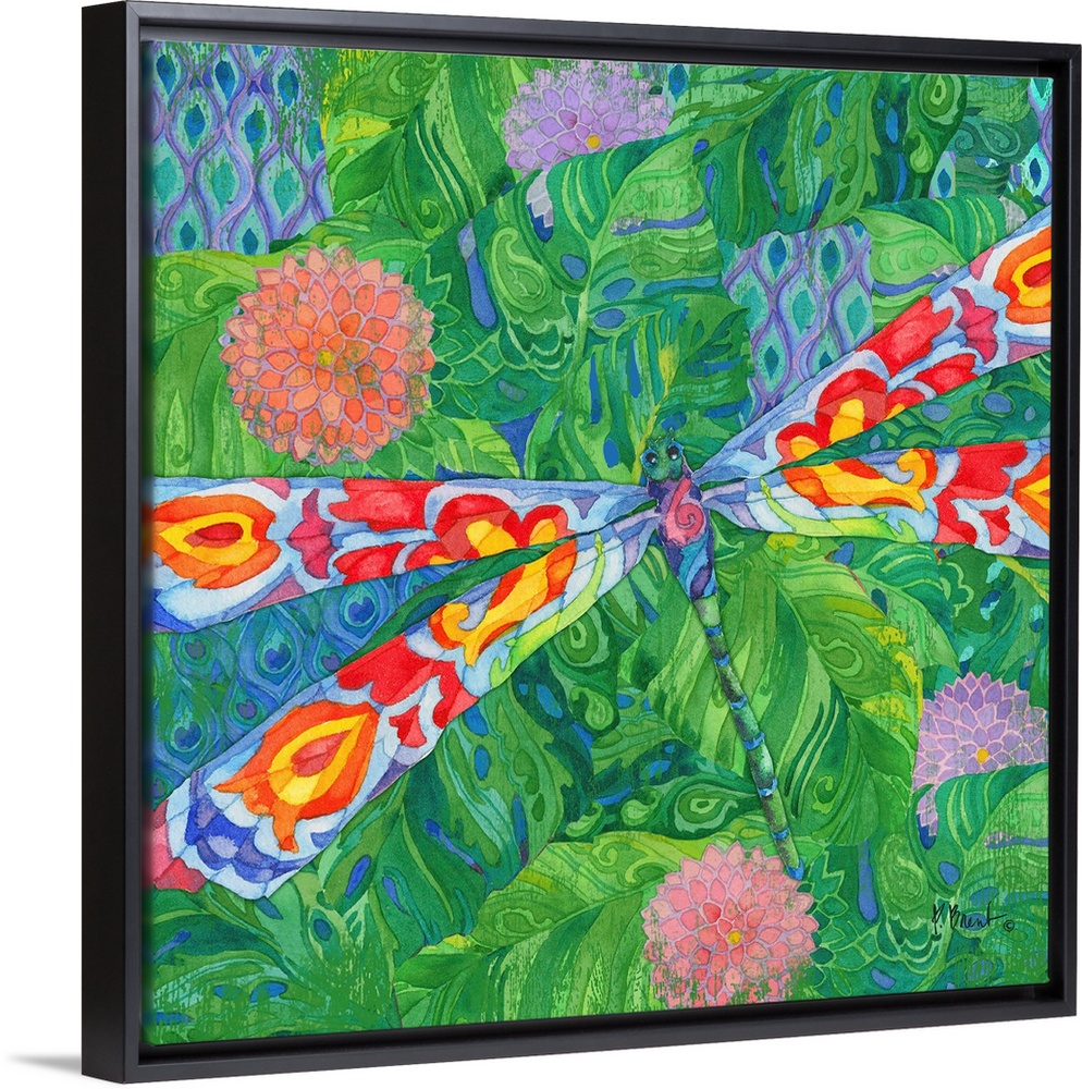 <p>Square watercolor painting of a beautifully designed dragonfly in bright colors on a background made with decorative leaves and flowers.</p>