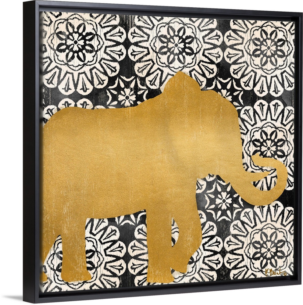 <p>Square decor with a metallic gold silhouette of an elephant on a black and white mandela patterned background.</p>