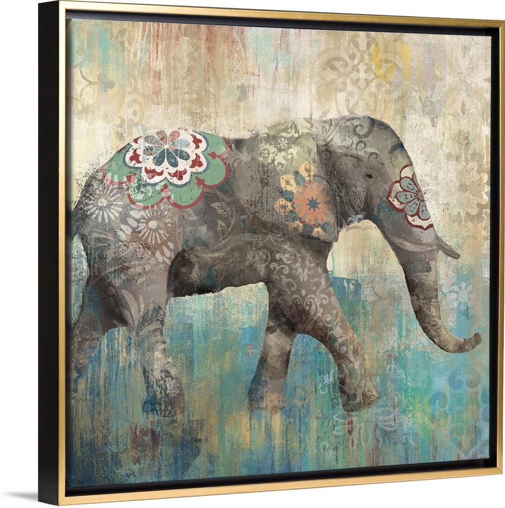 <p>Decorative artwork of an elephant with tusk with a distressed overlay of colored brush strokes and floral designs.</p>