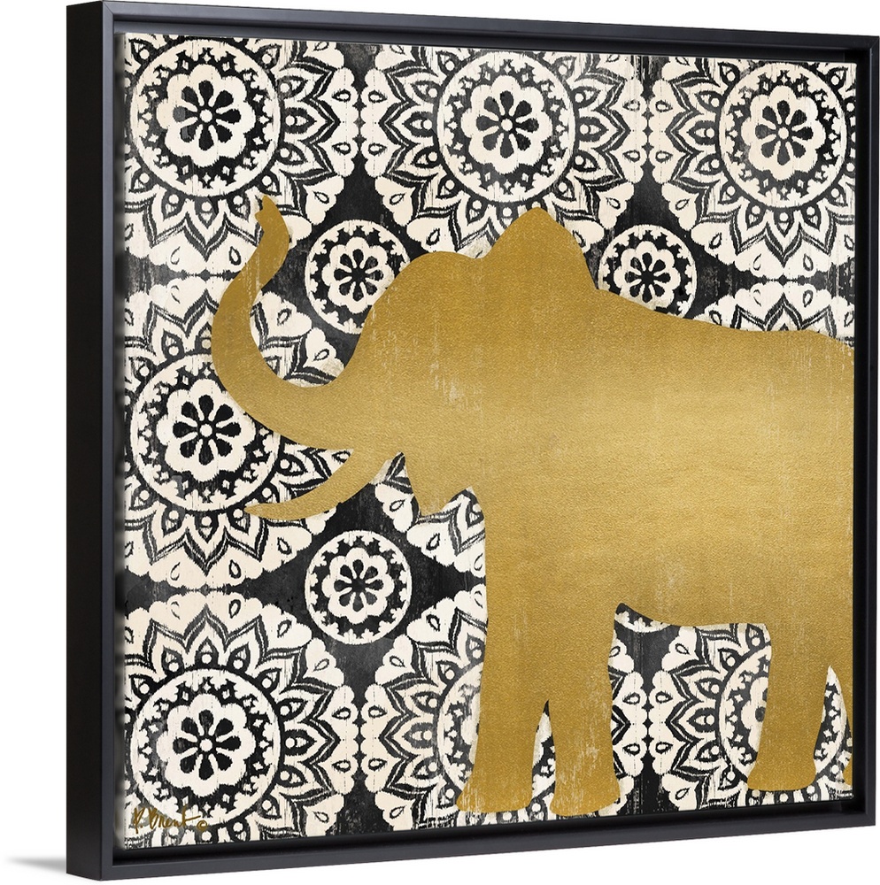 <p>Square decor with a metallic gold silhouette of an elephant on a black and white mandela patterned background.</p>