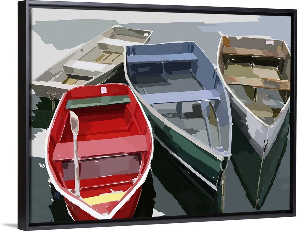 <p>Artwork of four empty wooden boats floating in the water.</p>