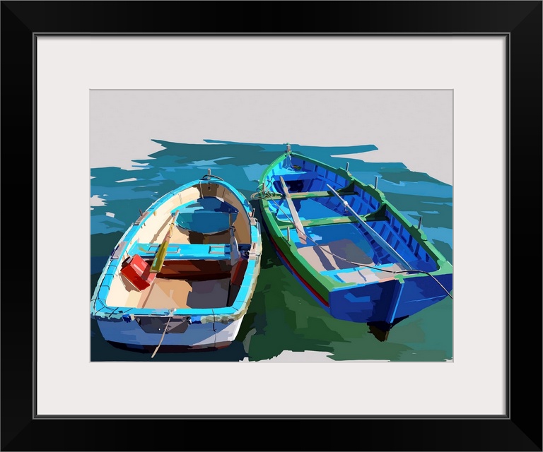 <p>Contemporary painting of two empty blue boats floating in the water.</p>