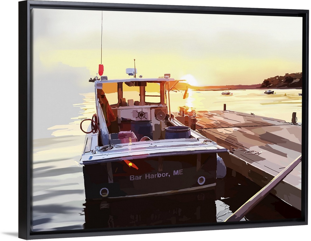 <p>Illustration of a boat docked at a pier at sunset.</p>