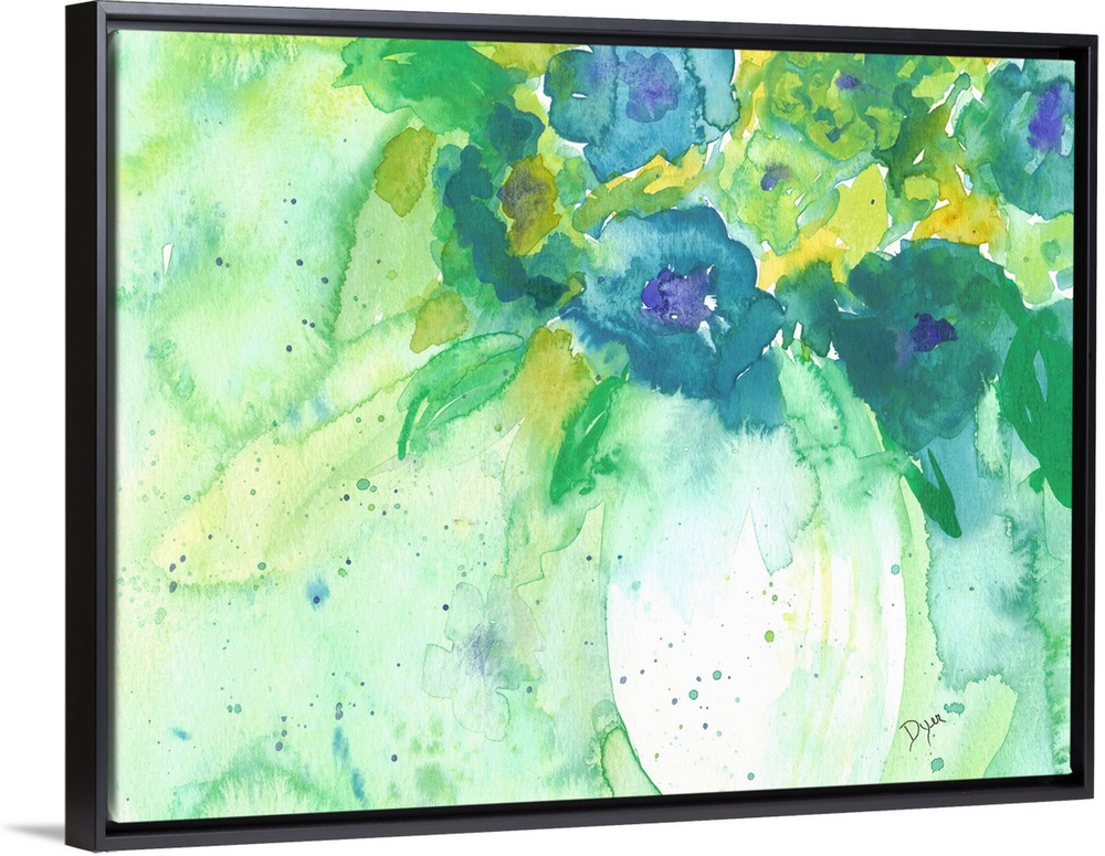 <p>Cool toned watercolor painting of a bouquet of flowers in a vase</p>