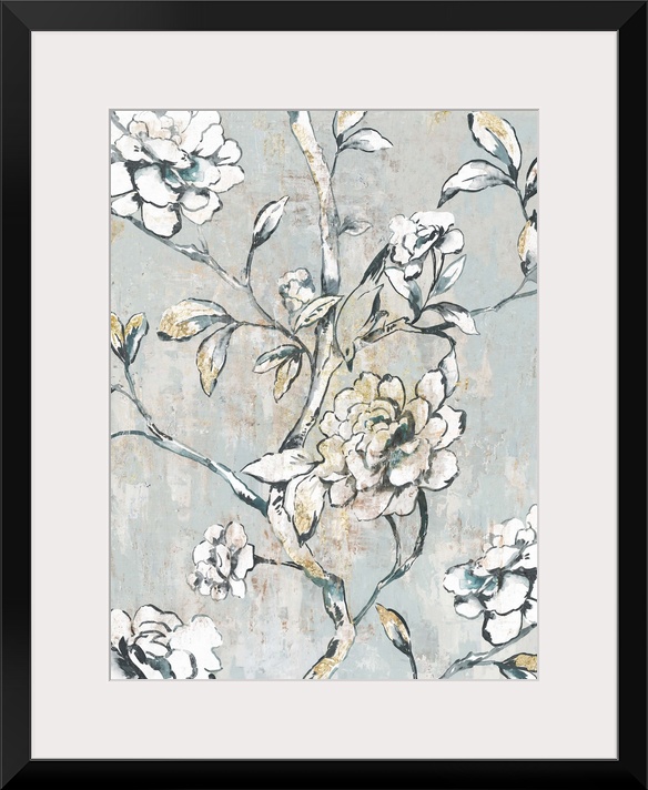 <p>A contemporary painting of white flower blooms on leaf covered stems against a neutral textured backdrop.</p>