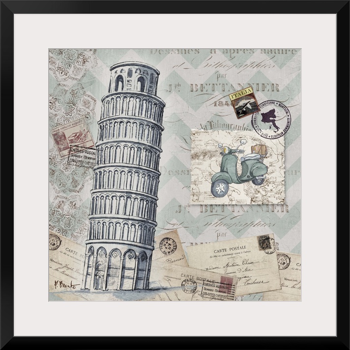 <p>Mixed media panel showcasing a travel themed collection, including postcards, stamps, a vespa, and the leaning tower of Pisa.</p>