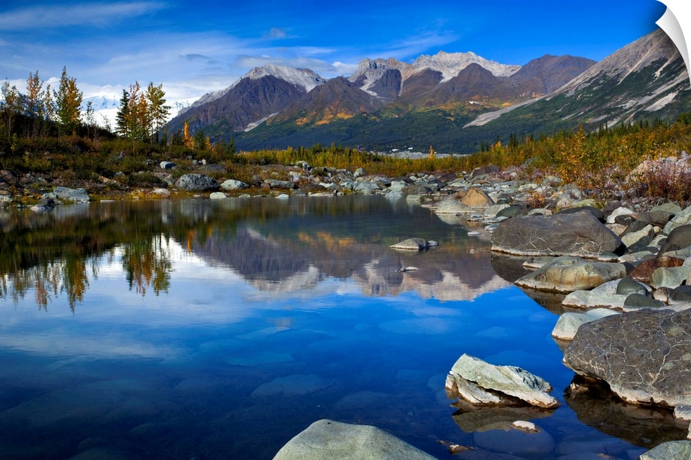 <p>Bonanza Ridge and its reflection on a waterhole by the toe of Kennicott Glacier, Wrangell St. Elias National Park & Preserve, Southcentral Alaska, Autumn</p>