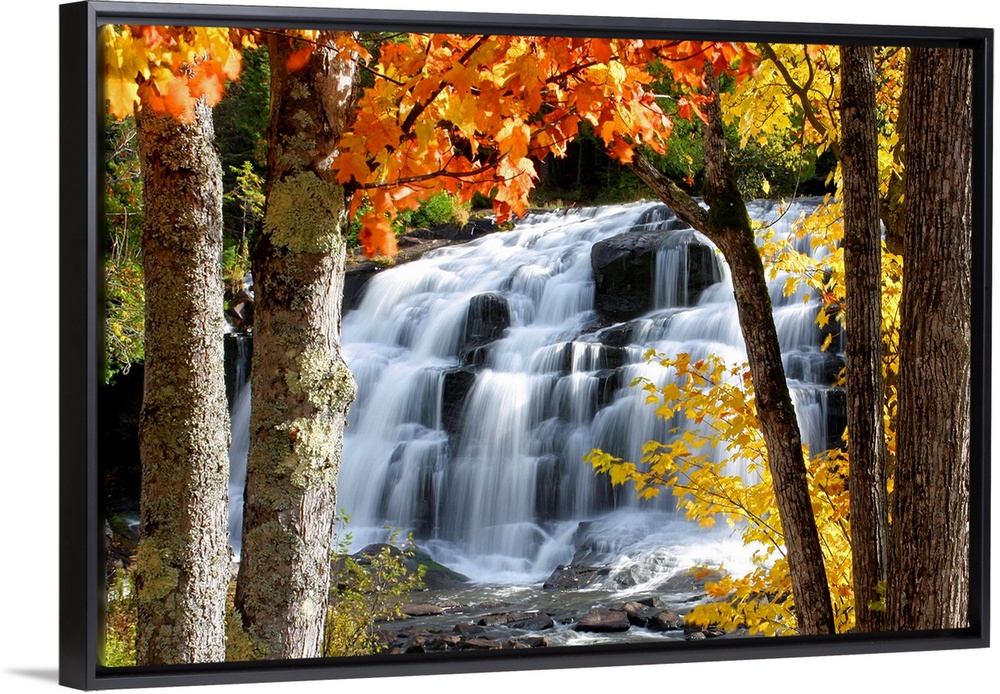 <p>Horizontal, photograph on a giant canvas of Bond Falls in Paulding, Michigan, cascading over rocks. Trees with fall foliage in the foreground.</p>