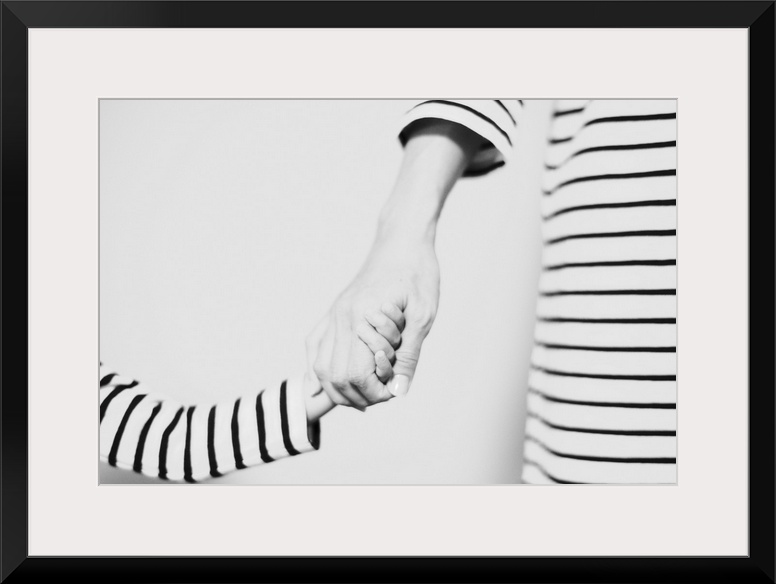 <p>A person in a striped shirt holding hands with a child wearing a matching outfit.</p>