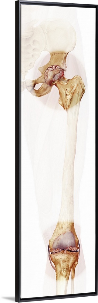 <p>Bone death. Computer artwork of a human hip and knee joint affected by osteonecrosis - death of the bone tissue. This condition is caused by an impaired blood supply to the bone cells, which may have resulted from an injury or disease.</p>