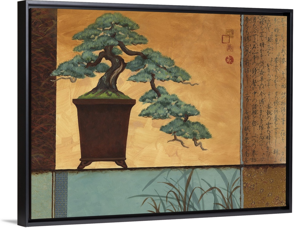 <p>Asian style painting of a bonsai plant in a tall vase.</p>