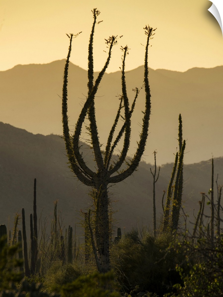 <p>Boojum trees (Fouquieria columnaris) silhouetted at sunset at the northern end of the Sea of Cortez, near Bahia de Los Angeles, Baja California, Mexico</p>