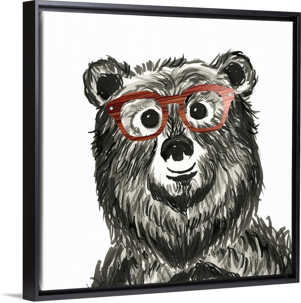 <p>Black and white illustration of a whimsical bear wearing wood grain glasses on a square background.</p>