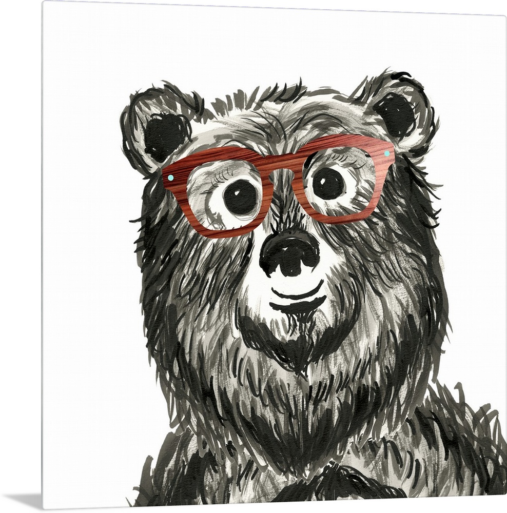 <p>Black and white illustration of a whimsical bear wearing wood grain glasses on a square background.</p>