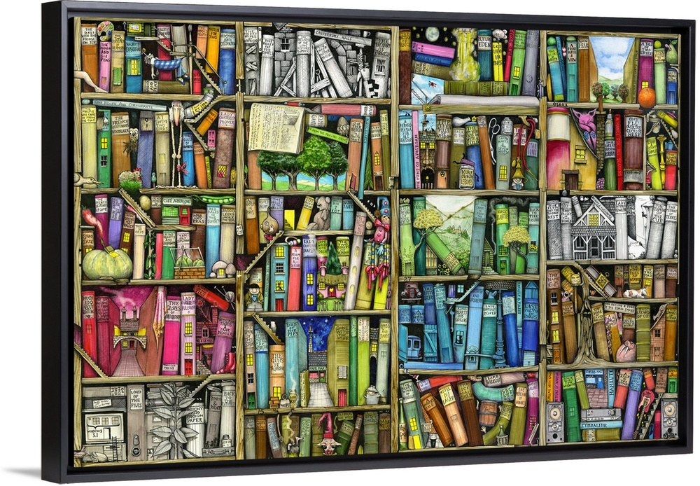 <p>Fantasy illustration of a shelf full of books with hidden figures and objects. Each section of the shelf creates a separate imaginative scene.</p>