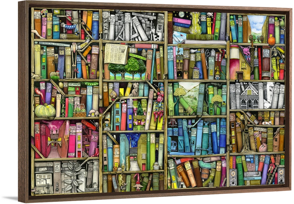 <p>Fantasy illustration of a shelf full of books with hidden figures and objects. Each section of the shelf creates a separate imaginative scene.</p>