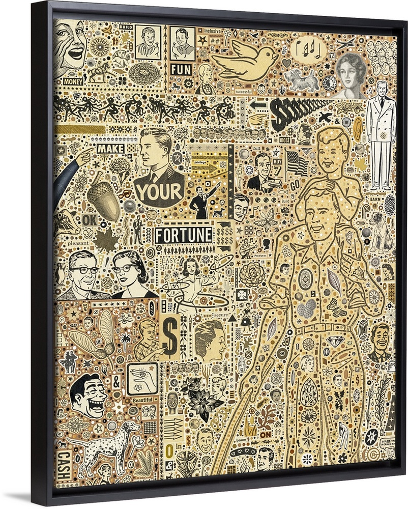 <p>Mixed media abstract art with hundreds of found elements, including text, illustrations, and symbols.</p>