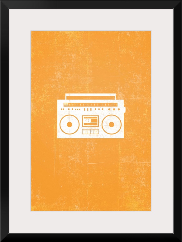 <p>Retro artwork that has a silhouette of a boom box against a bright orange background.</p>
