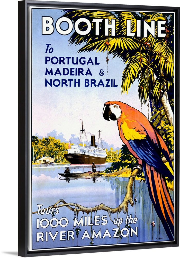 <p>Old advertising poster with a parrot in a palm tree and cruise liner in the distance with the text "To Portugal, Madeira, & North Brazil."</p>