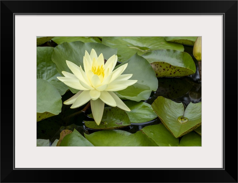 <p>Boothbay Harbor, Maine, USA. Coastal Maine Botanical Gardens. Yellow Water Lily (Nymphea Mexicana). United States, Maine.</p>